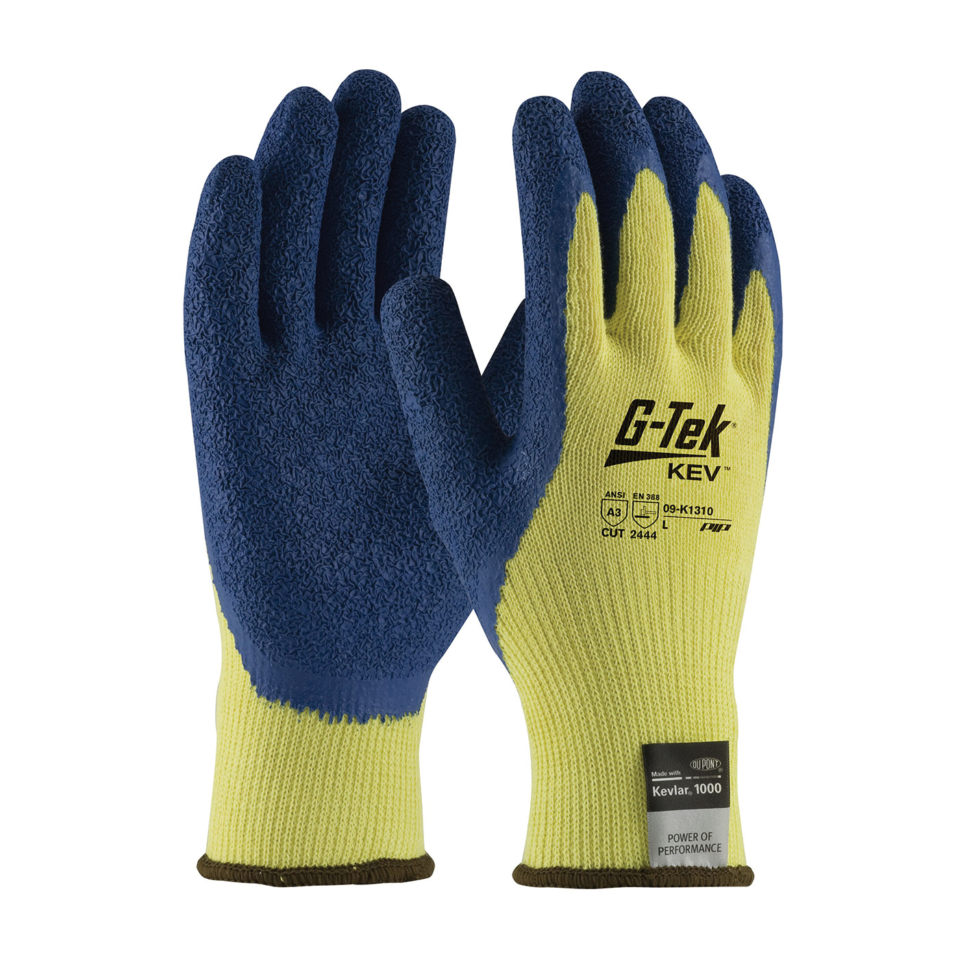 G-Tek® KEV™ Cut Resistant Gloves, Medium Weight Unisex, Series: 09-K1310, XL Size, Crinkle Latex Palm, Crinkle Latex Coating, DuPont™ Kevlar® Fiber, Blue/Yellow, Seamless Style, DuPont™ Kevlar® Fiber Lining, Elastic/Knit Wrist Cuff, 10.7 in Length, ANSI Cut-Resistance Level: A3, Resists: Abrasion, Cut, Puncture and Tear