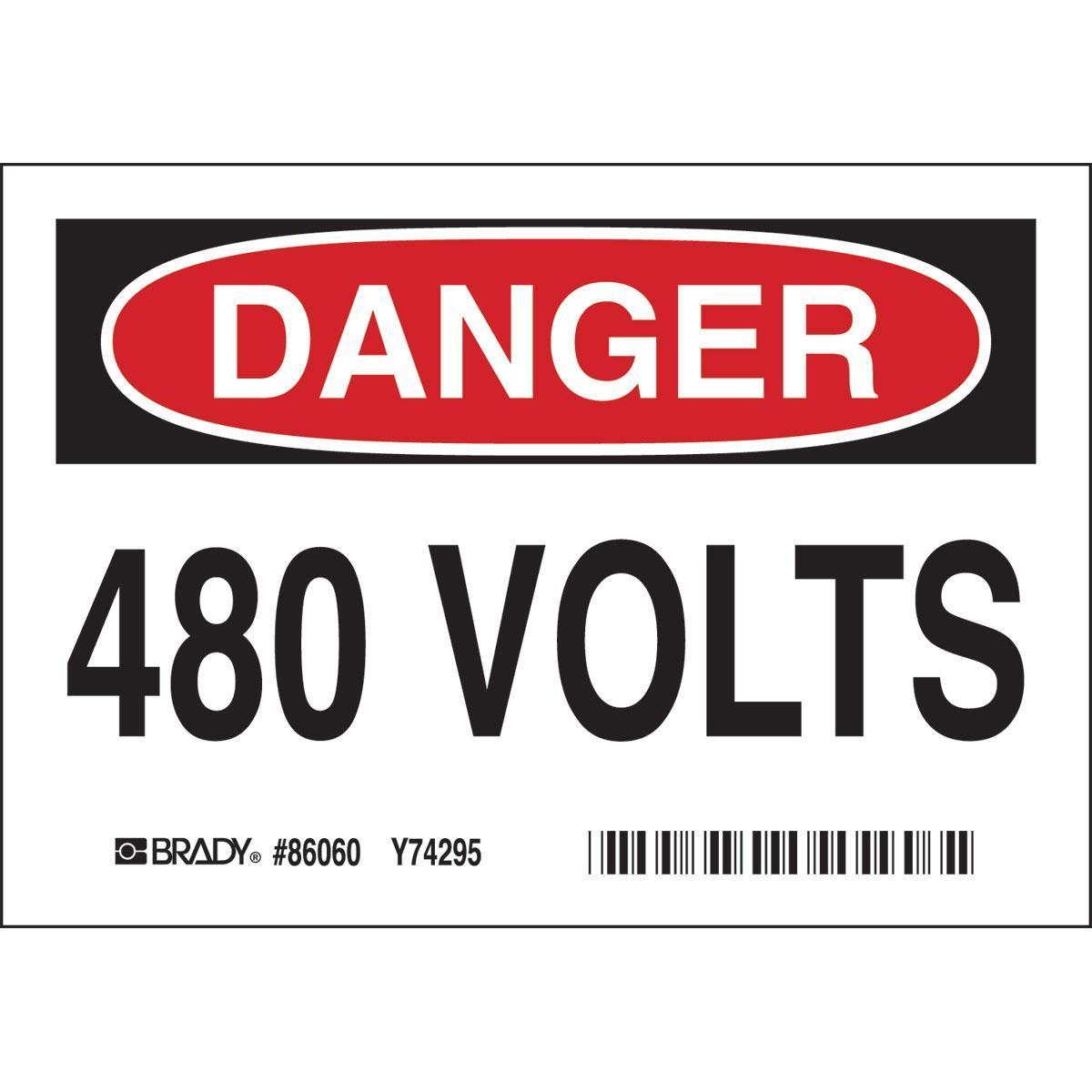 Brady® Conduit and Voltage Sign, Overlaminated Rectangular, Header: DANGER, Text Legend, Legend: 480 VOLTS, B-302 Polyester, Adhesive Mounting, 3-1/2 in Height, 5 in Width, Black/Red on White Legend/Background