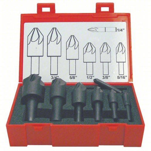 6-Flute Countersink sets include one piece each of 1/4″, 5/16″, 3/8″, 1/2″, 5/8″, 3/4″, 1″ body diameter with a particular included point angle.KEO® 919 Cobalt 82° 7-Piece 6-Flute Countersink Set, Uncoated, contains Body Diameters: Ø1/4″,Ø5/16″ , Ø3/8″, Ø1/2″, Ø3/4″, Ø1″